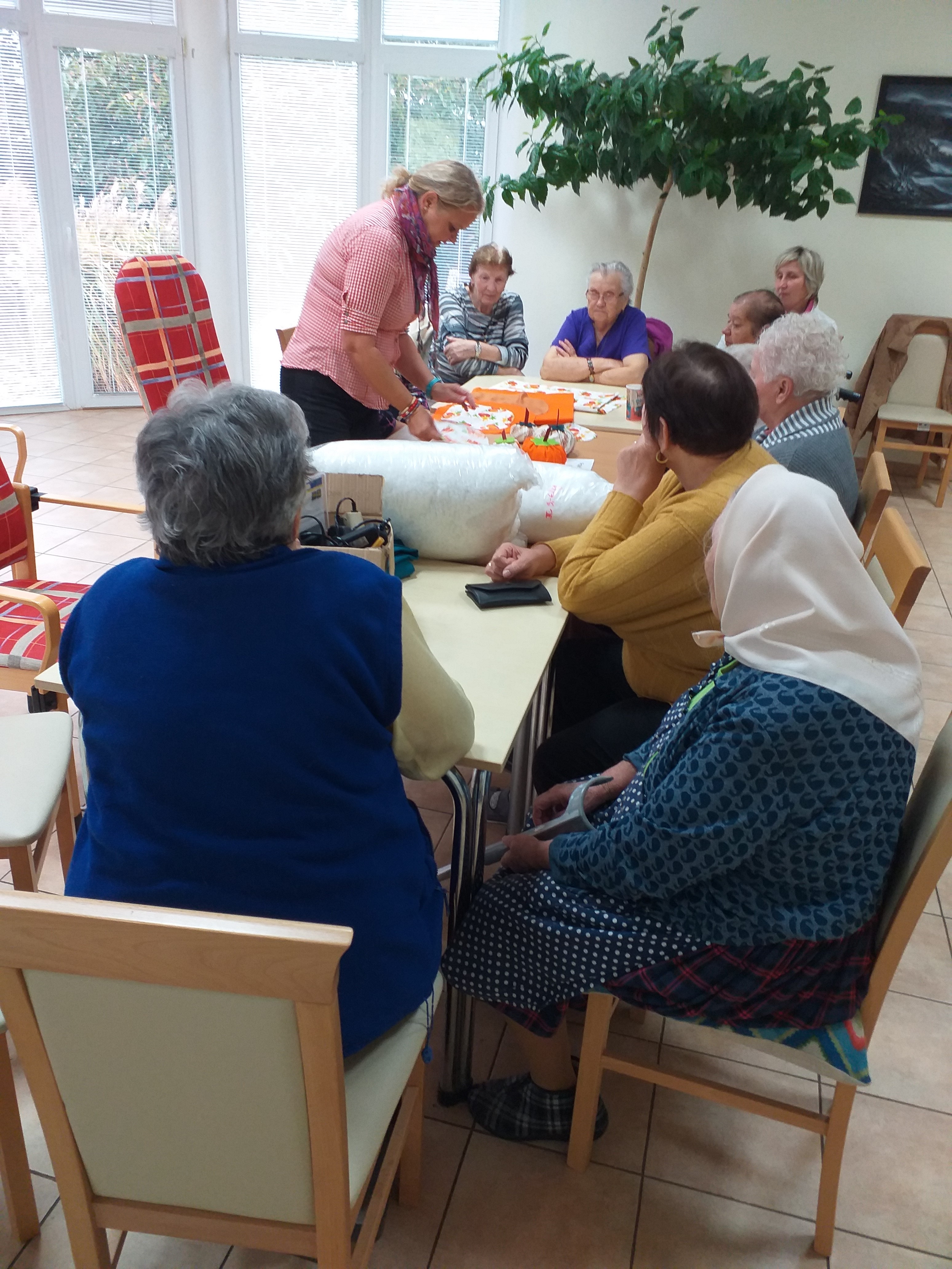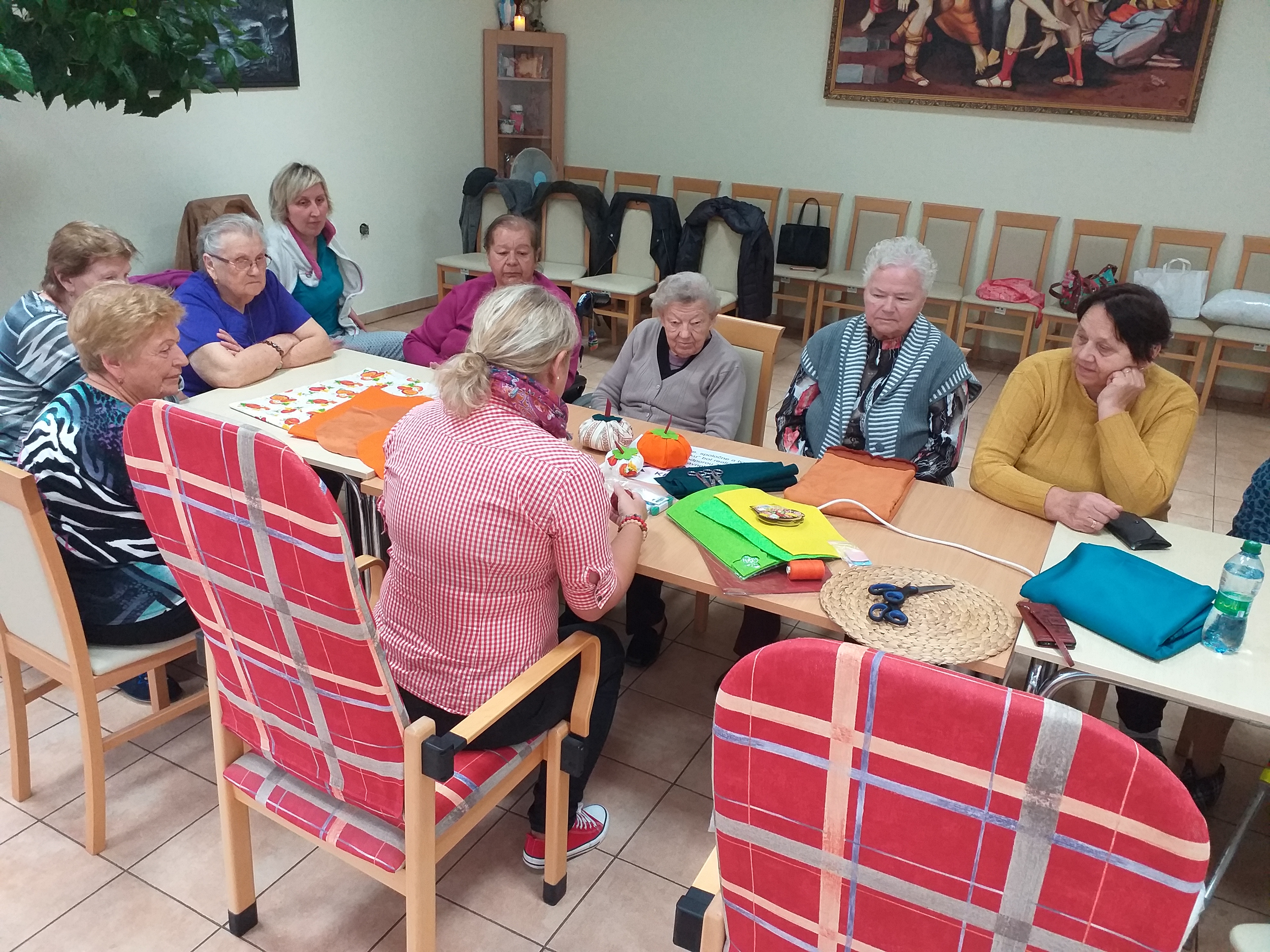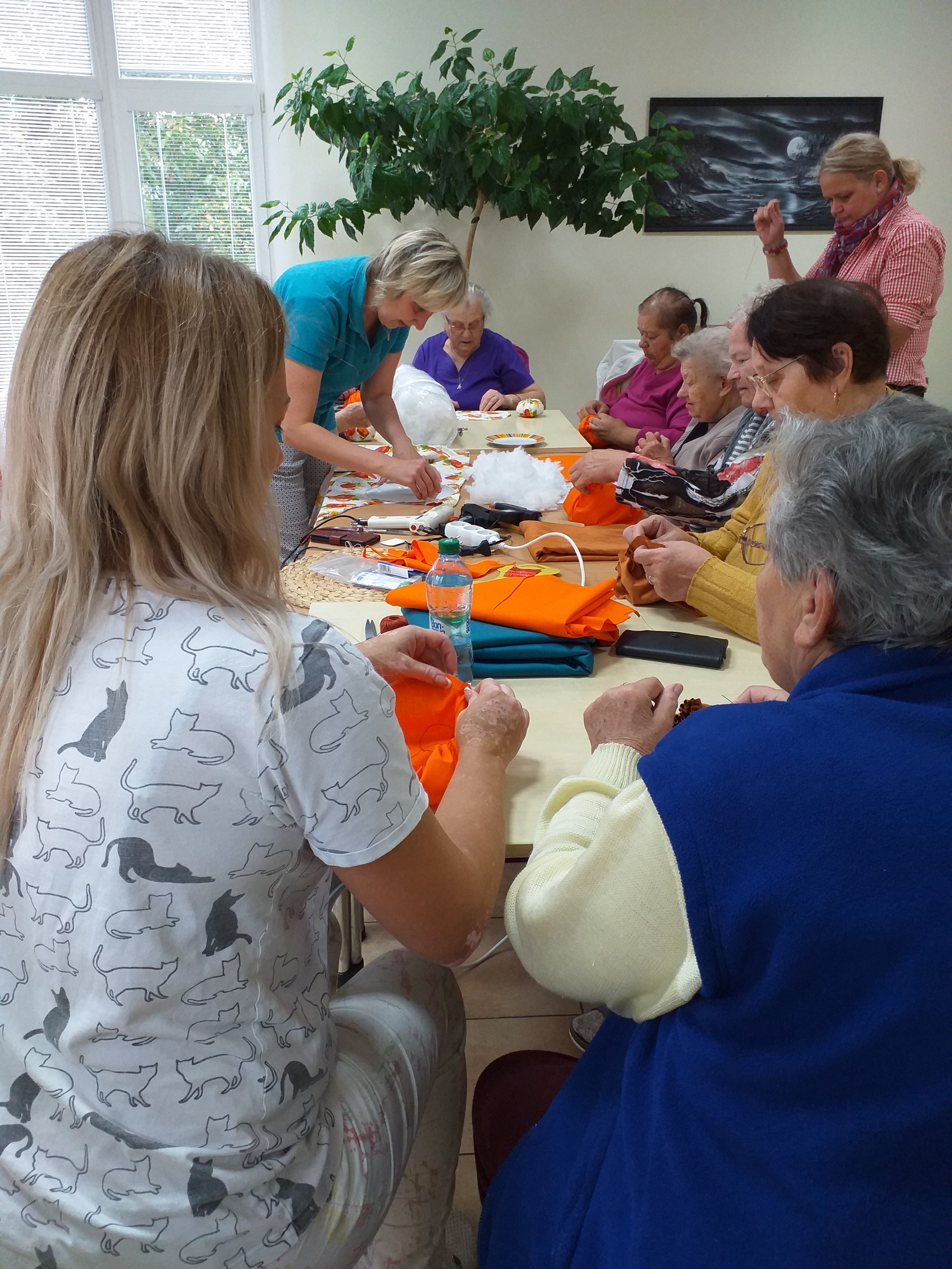 Aktívne trávený voľný čas podporuje blaho seniorov, pretože potrebujú mentálnu, sociálnu a fyzickú stimuláciu, aby zostali činný aj napriek veku. V spolupráci s mestom Gbely a p. Kvaltínovou Lenkou sme zorganizovali workshop na tému jesenného tvorenia. Klientky si vyrobili tekvicovú výzdobu do svojich izieb aj spoločenských priestorov oboch budov, aj keď zo začiatku s veľkým strachom, že šitie už dávno zabudli. Ručné práce im pomáhajú pri zlepšovaní koordinácie očí a rúk, jemnú motoriku, rovnako i posilňujú dôveru a sociálne vzťahy. Verím, že všetkým zúčastneným sa táto aktivita páčila, nakoľko odchádzali s úsmevom. Strávili sme príjemné spoločné doobedie.