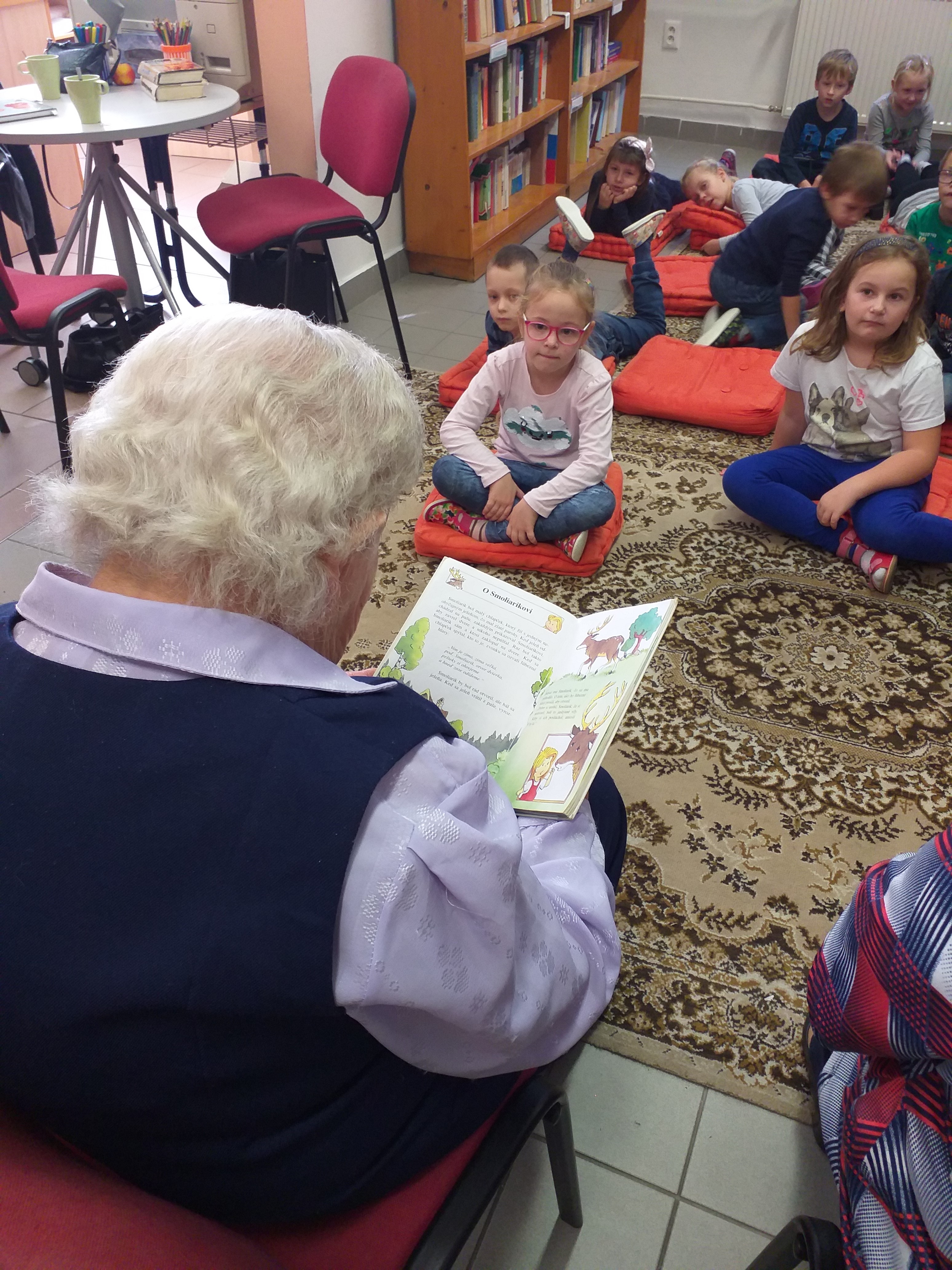 V rámci medzigeneračného prepojenia našich seniorov a detičiek zo základnej školy sme navštívili mestskú knižnicu, do ktorej pozvali naše klientky. Na túto akciu sa veľmi tešili. Činnosti s prvkami biblioterapie v našom zariadení prebiehajú v rôznych formách, a preto sme sa radi zúčasnili aj tejto výnimočnej situácie, kedy prečítali klasické rozprávky - O medovníkovom domčeku a O Smolíčkovi, deťom 1. ročníka. Žiaci boli veľmi zvedaví i zhovorčiví. V diskusií zhodnotili prečítaný text, porozprávali sa o školách v minulosti, ale i o blížiacom sa predvianočnom období. Tieto výnimočné chvíle, keď sa cítia opäť potrebné im vyčarovali úsmev na tvári. Príjemné posedenie pri čaji a knihe rýchlo ubehlo. Na záver naše klientky obdarovali krásnou kytičkou.