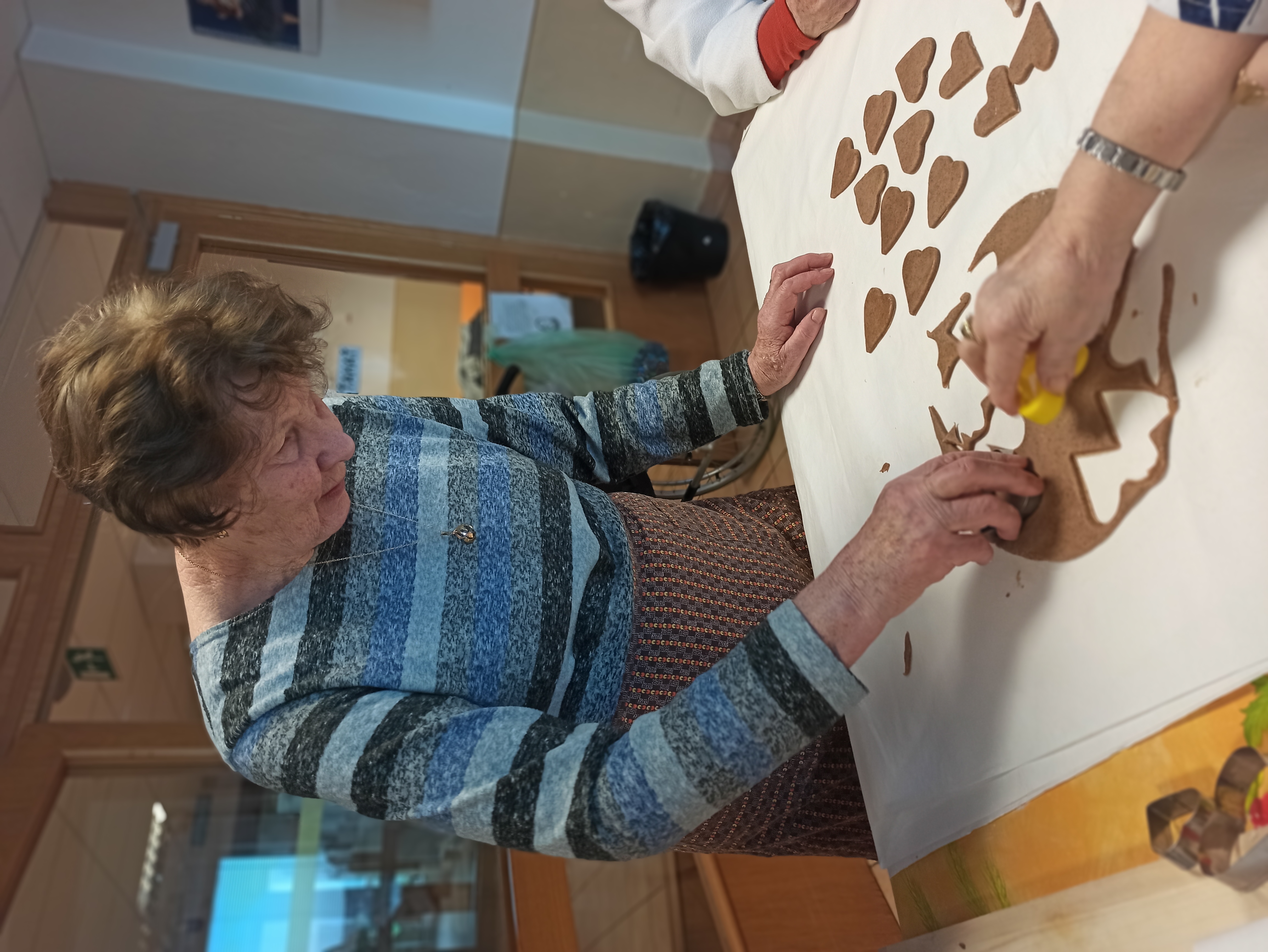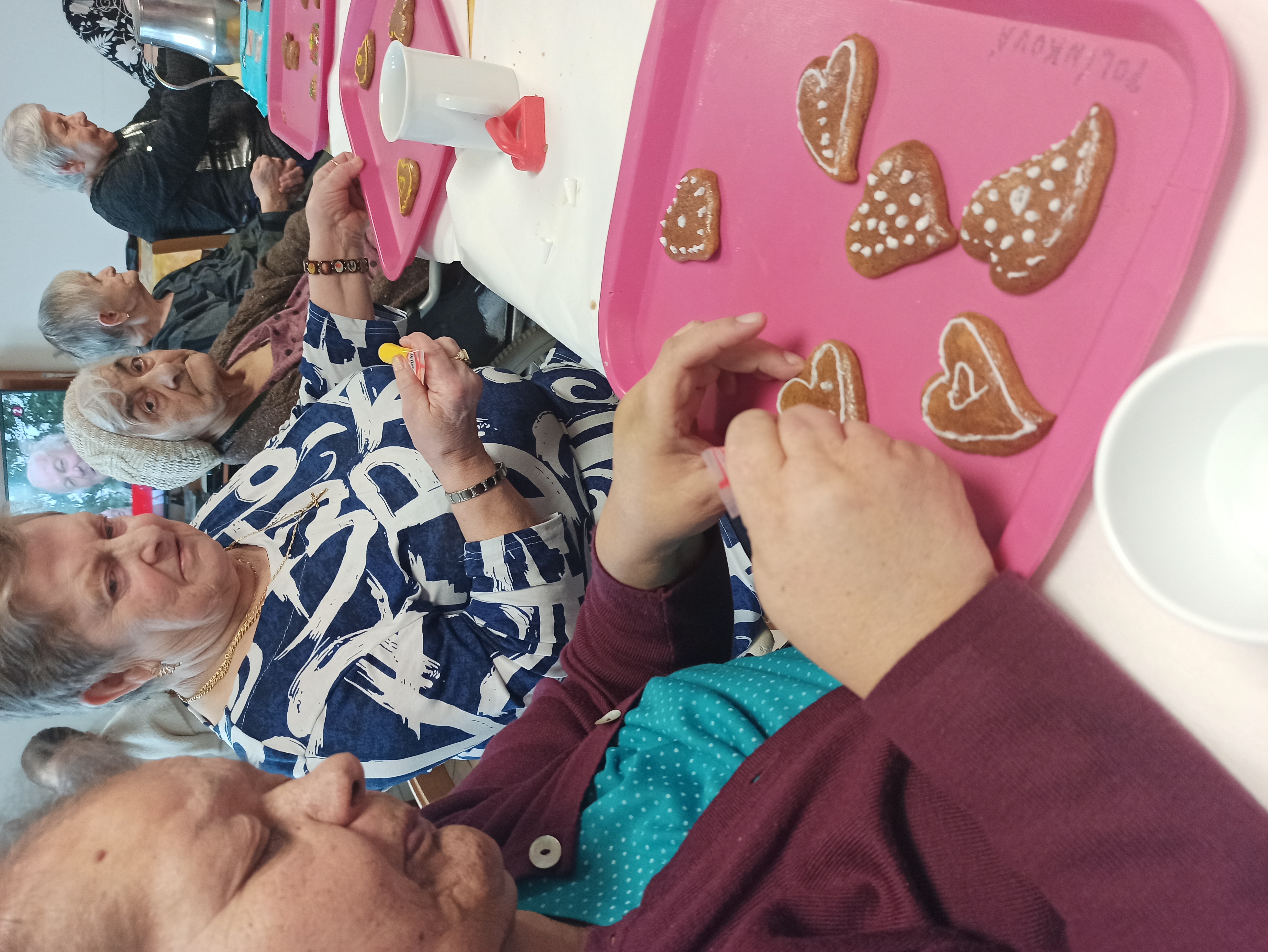 Ďalšou spoločne organizovanou terapiou pre klientov na oboch budovách bolo pečenie Valentínskych medových srdiečok. Obyvatelia budovy na Hudecovej ulici tento raz pripravili medovníkové cesto podľa svojho vlastného a osvedčeného receptu. Na ďalší deň celé doobedie všetci spolu vykrajovali, piekli i zdobili srdiečka. Týmito v piatok, na deň sv. Valentína, z lásky obdarujú všetkých obyvateľov na oboch budovách.