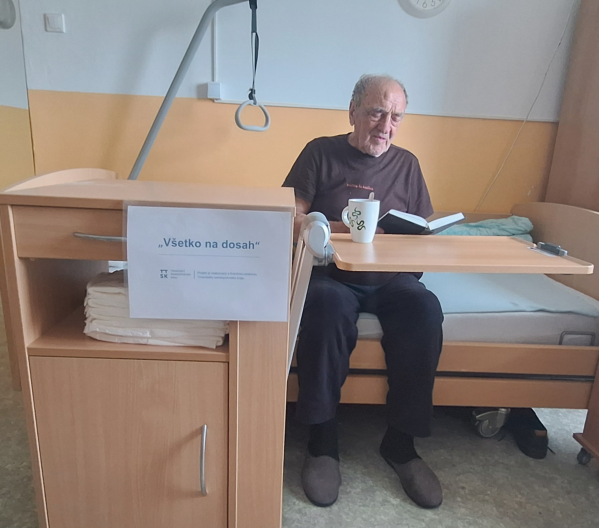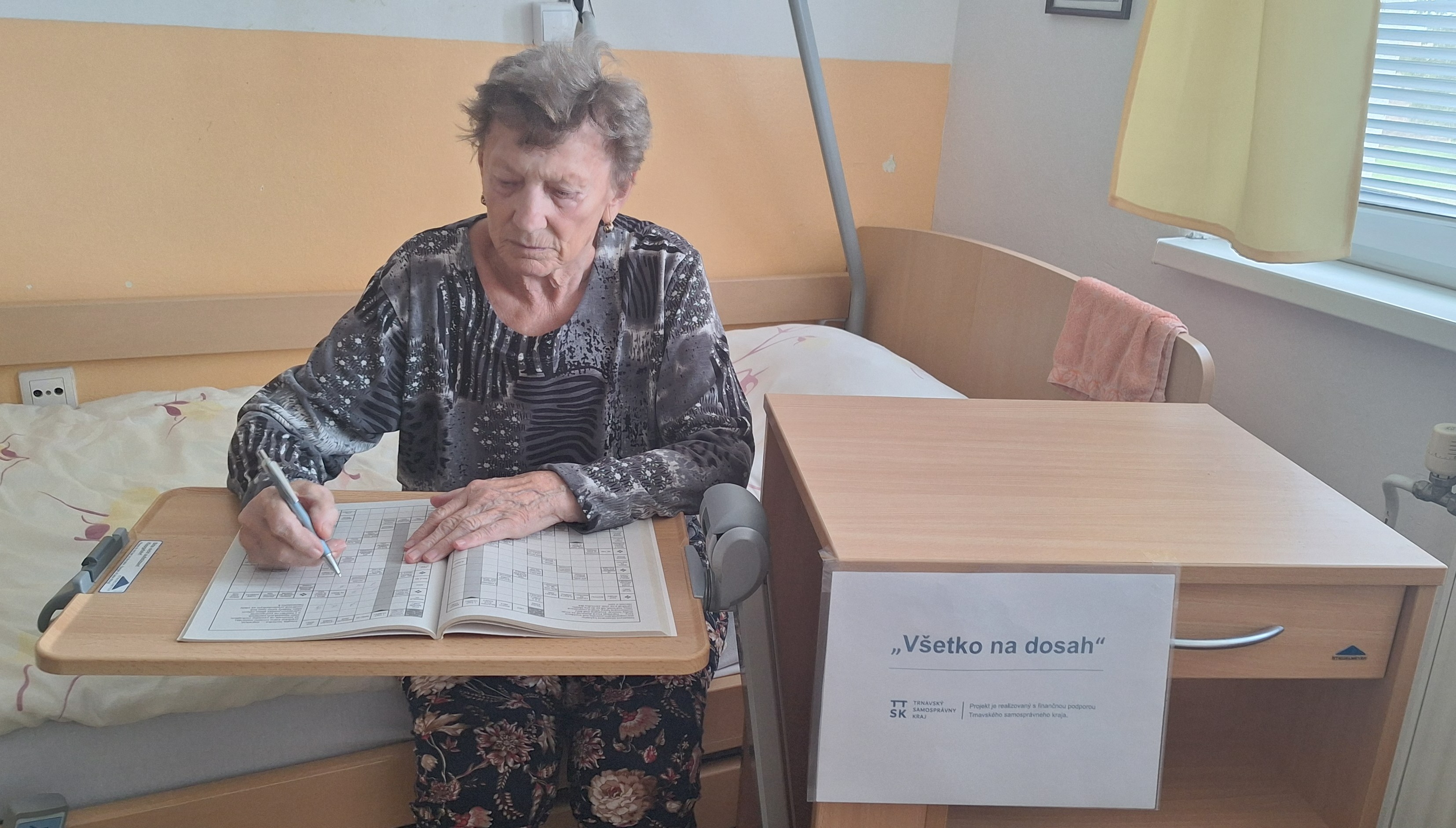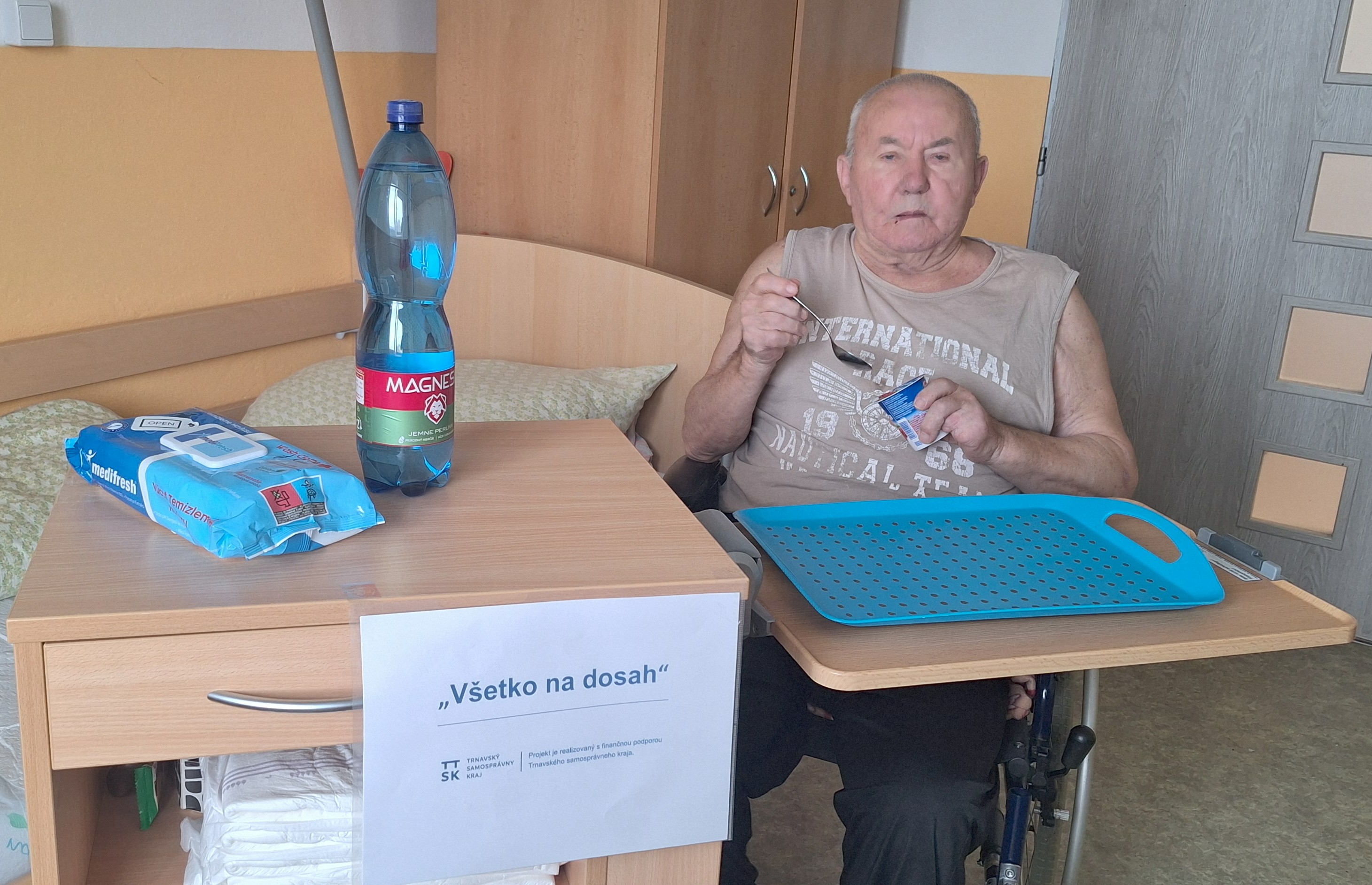 Úspešným projektom "Všetko na dosah" získalo naše zariadenie finančné prostriedky z Trnavského samosprávneho kraja na nákup nočných stolíkov s jedálenskou doskou. Nočné stolíky boli poskytnuté prijímateľľom sociálnych služieb, ktorí sú väčšiu časť dňa pripútaní na lôžko. Stolíky majú výsuvnú jedálenskú dosku, takže majú všetky veci na dosah. Tento projekt bol realizovaný s finančnou podporou Trnavského samosprávneho kraja.