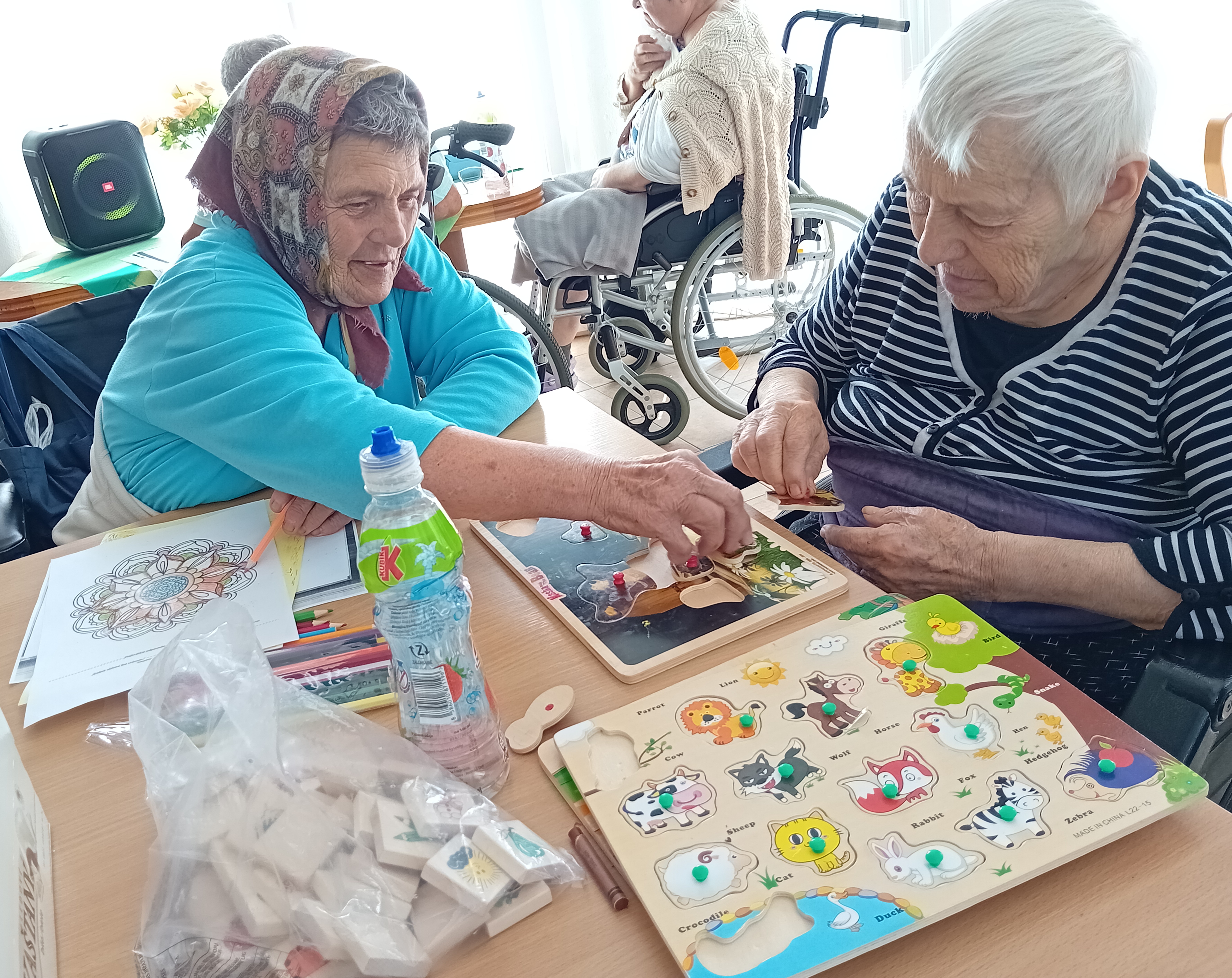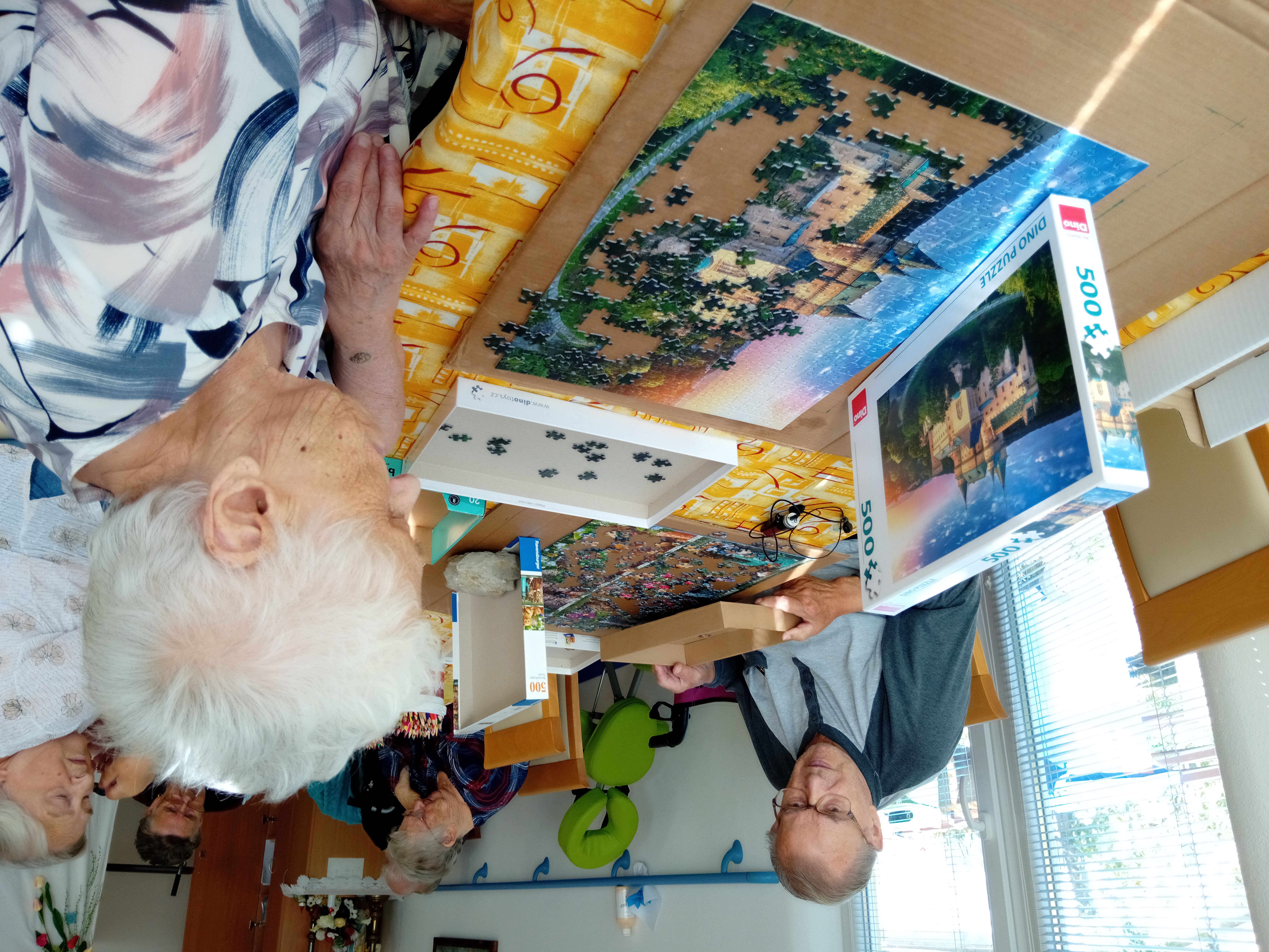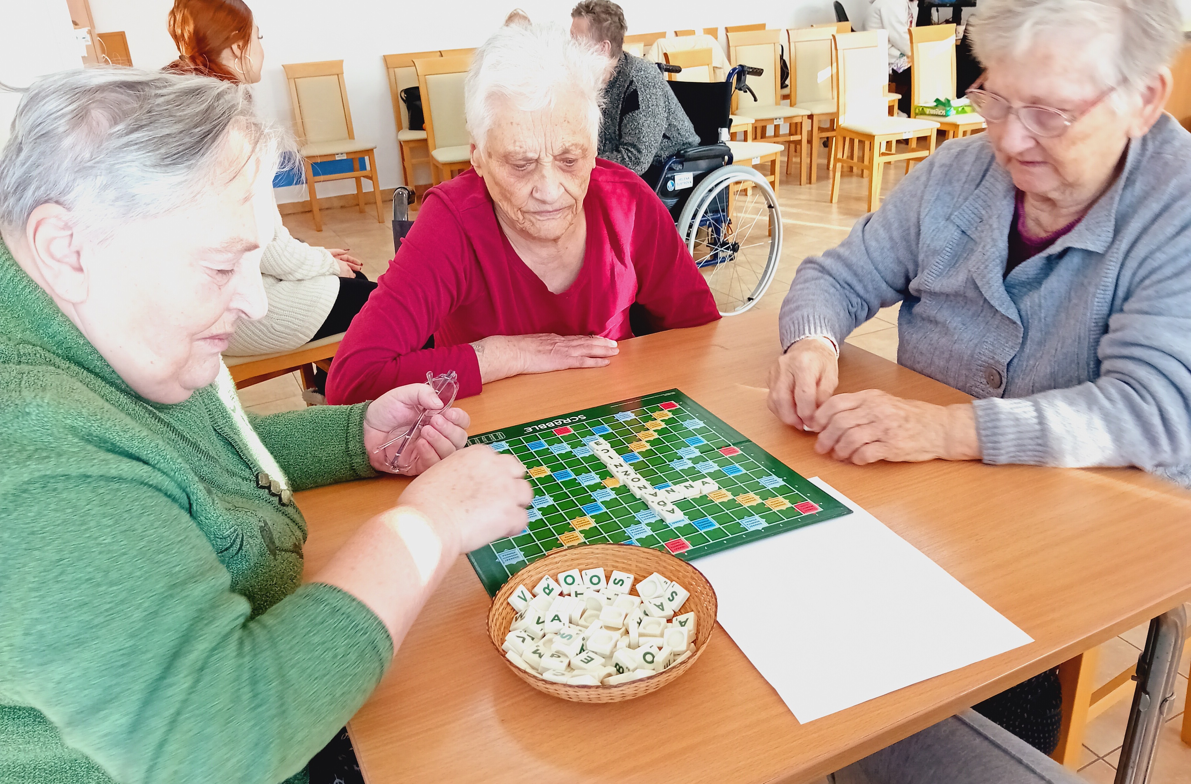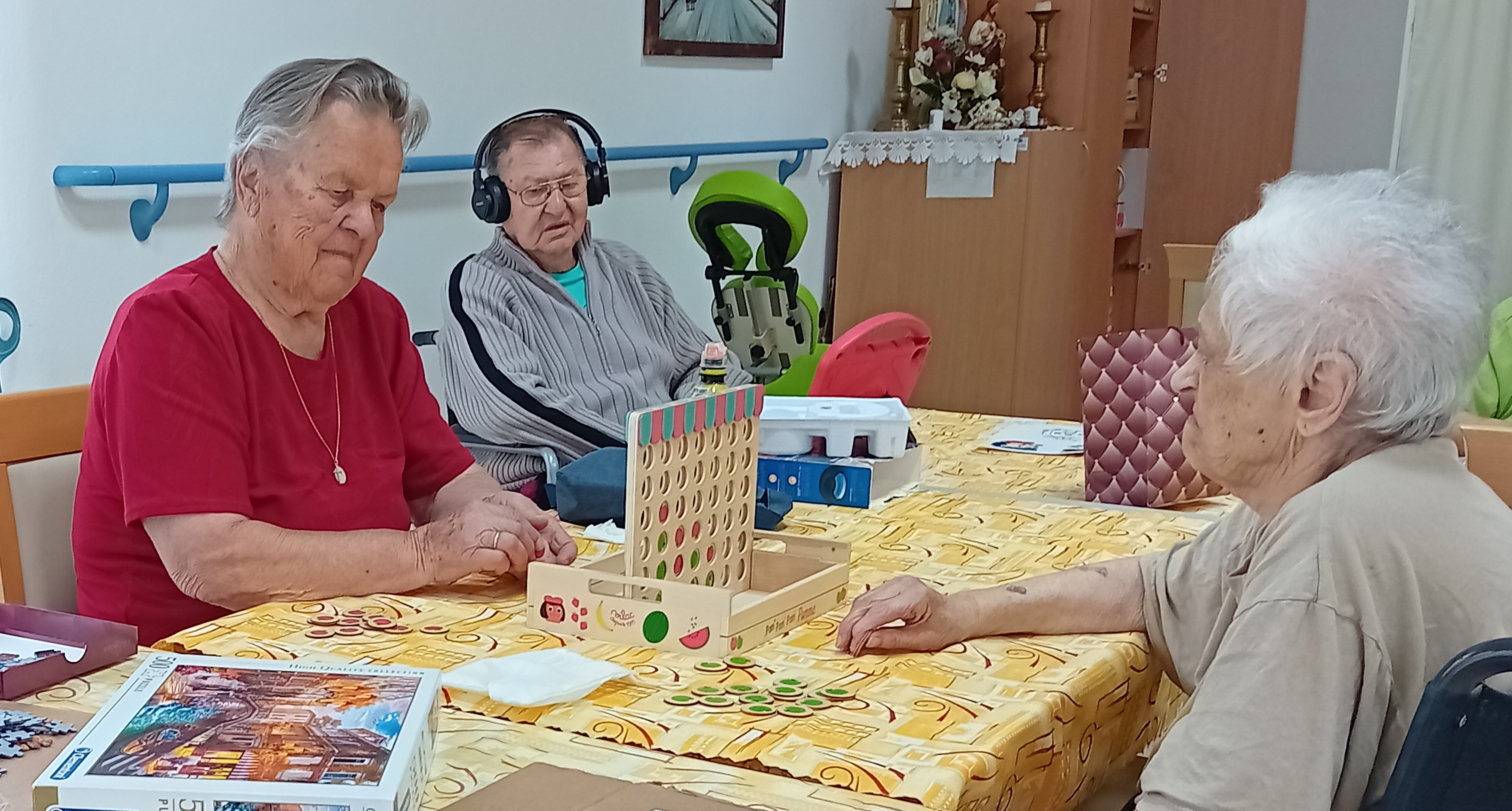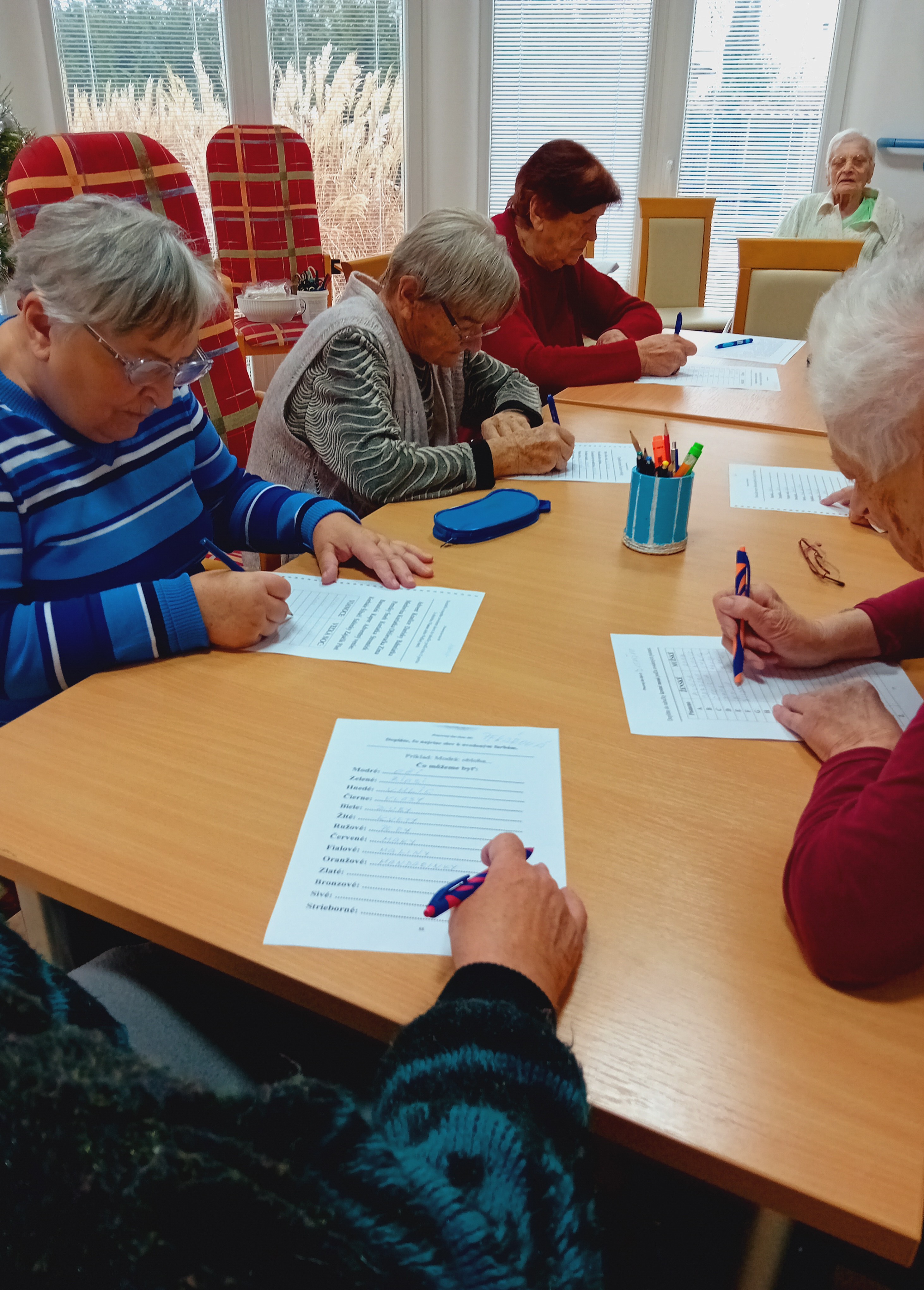 Kognitívne funkcie sú súbor schopností, ktoré nám umožňujú spracovávať informácie, učiť sa a efektívne vykonávať rôzne úlohy. Medzi tieto funkcie patrí pamäť, pozornosť, myslenie, orientácia, kreativita a schopnosť riešiť problémy. Tréning kognitívnych funkcií sa zameriava na posilnenie týchto schopností prostredníctvom cvičení a aktivít. Cvičenia na pamäť pomáhajú aktívnym seniorom zlepšiť pamäť a tráviť čas zmysluplnou aktivitou. Mnohí naši seniori sa venujú rôznym cvičeniam, v pozadí im hraje zmes ľudových piesní, ktorá dotvára príjemnú atmosféru.